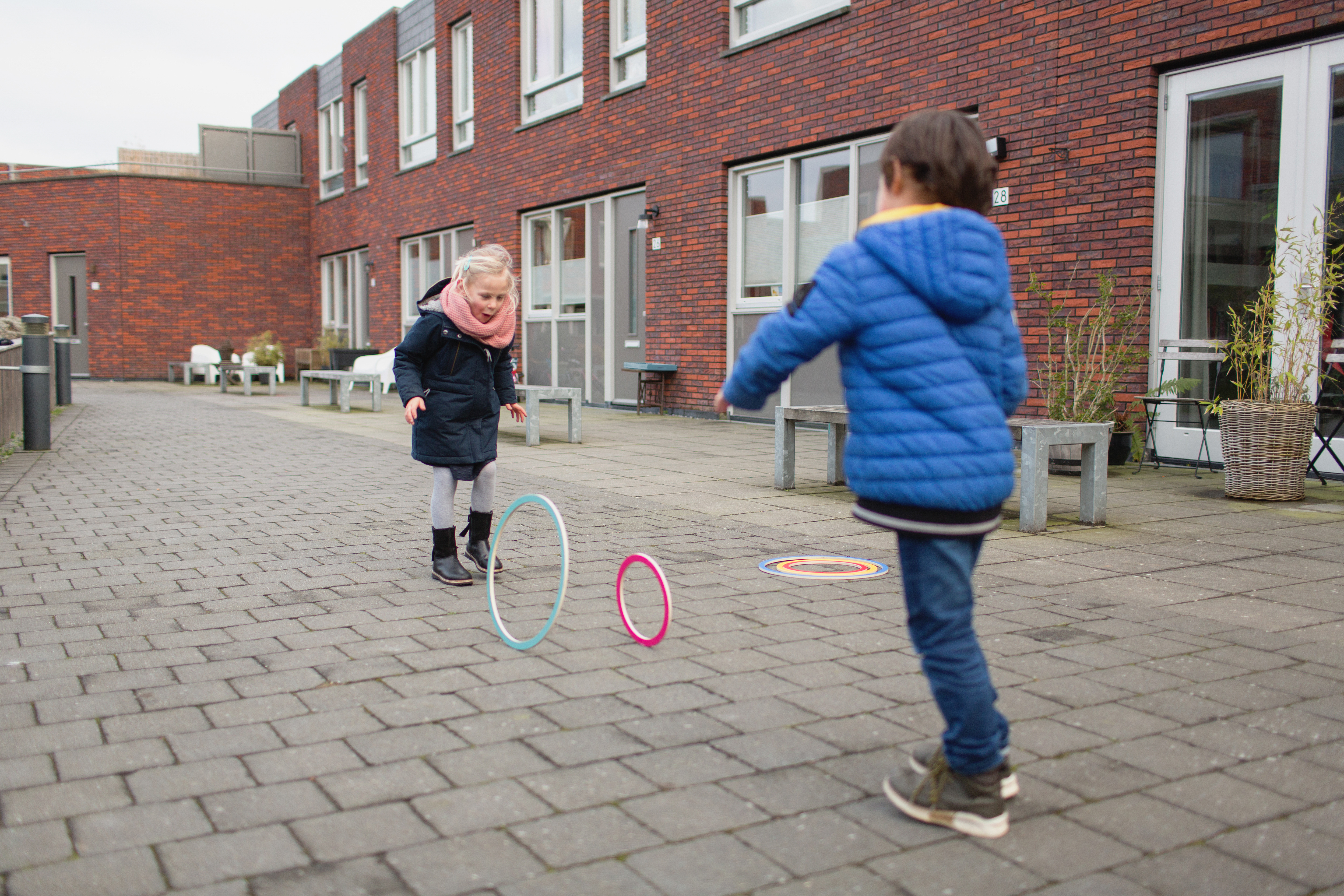 5 Ringe zum Werfen, Rollen und Hüpfen, Dazu 5 Spielsteine zum Zielen, Werfen und Fangen. Fünf verschiedene Spielvarianten sind in der Anleitung beschrieben, unzählige weitere möglich. Inhalt 5 Ringe und 5 Spielsteine, Maße der Ringe zwischen 25 bis 45 cm ø. Für Spielende ab 3 Jahren.