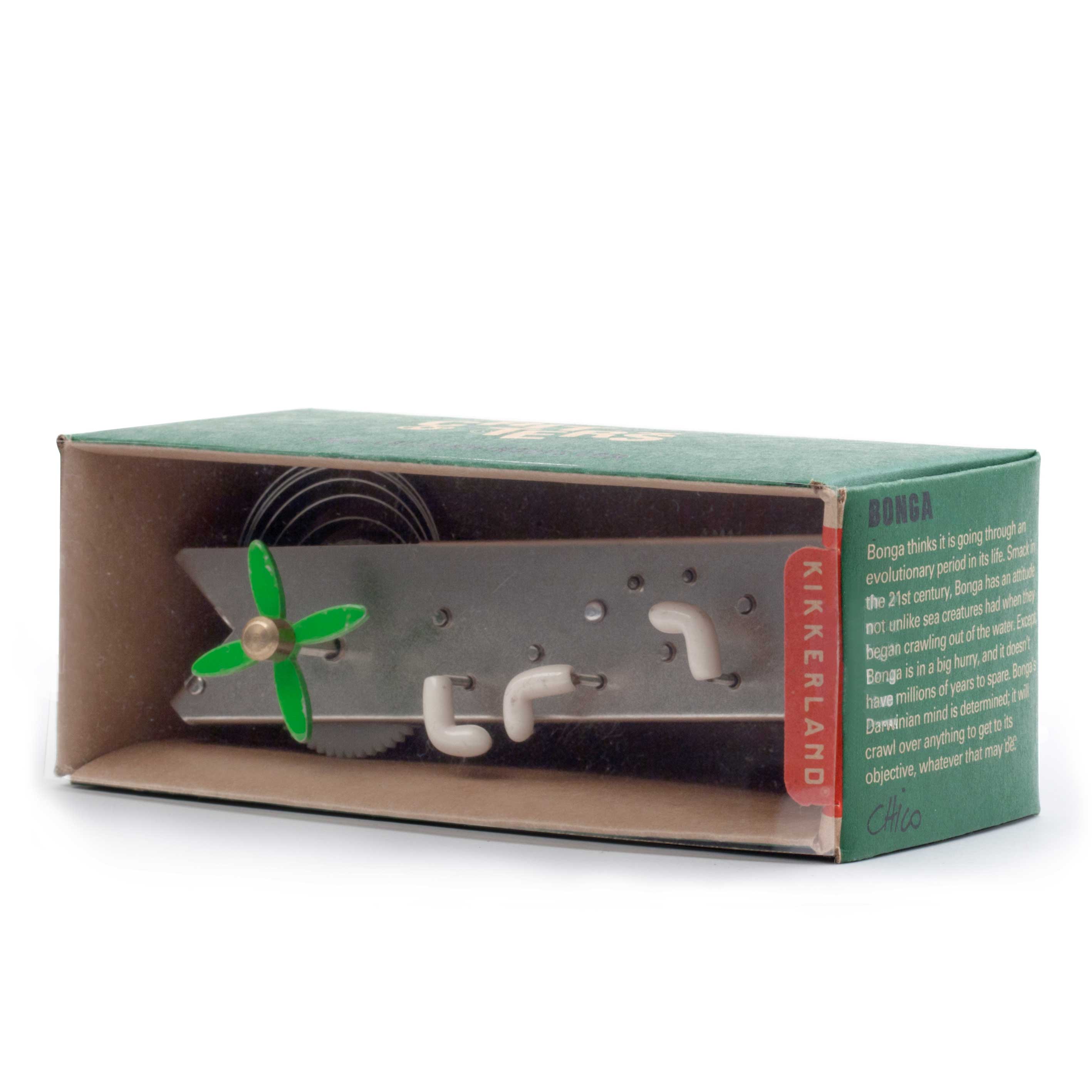 Bonga ist ein von einem mechanischen Federwerk angetriebener Kletterwurm. Dieses setzt das Objekt in Gang und überwindet so manches Hindernis. Etwa 12 cm lang.