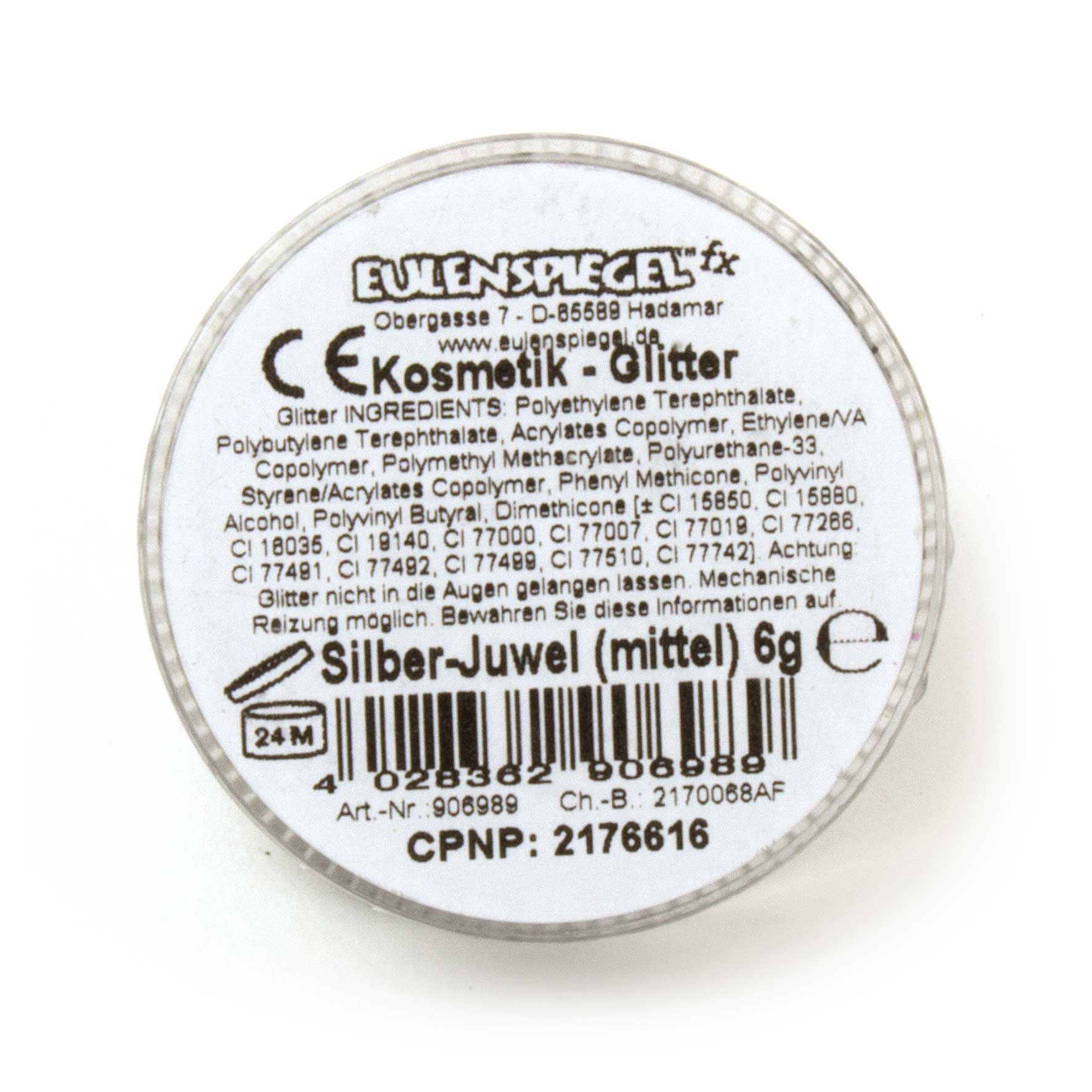 Irisierendes Glimmerpulver von Eulenspiegel. 6 g, silber. Die Verwendung dieses Glimmers ist einfach: Ein leicht angefeuchteter Pinsel wird in den Glimmer getaucht und die anhaftenden Partikel wie Farbe aufgetragen. Durch die Feuchtigkeit wird die Schminke angelöst und trocknet dann mit dem Glimmer.