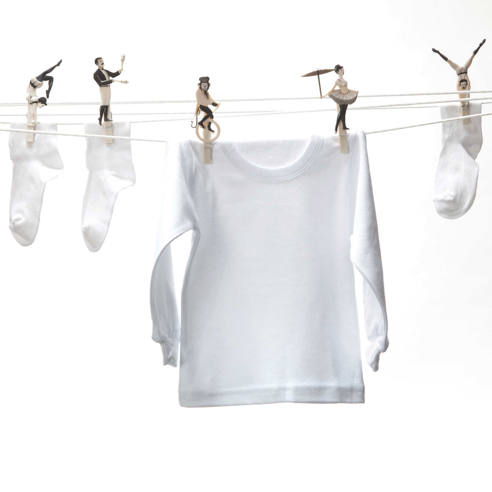 5 Artisten klettern über die Leine und halten Bilder, Blumen oder sogar Wäsche an ihrem Platz.