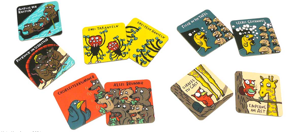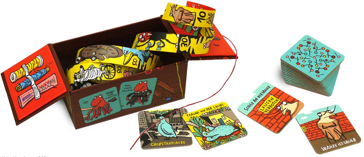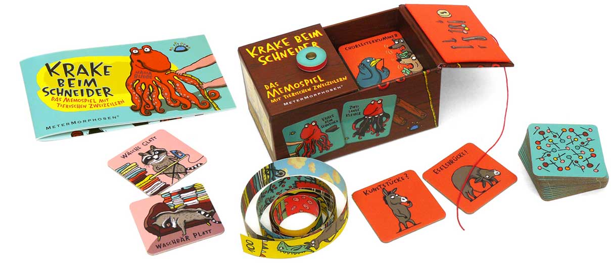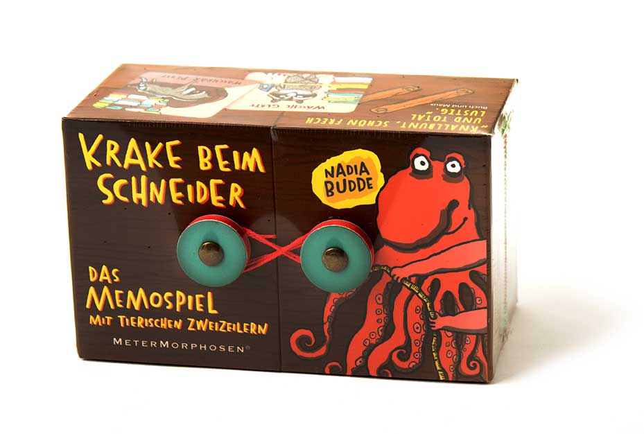KRAKE BEIM SCHNEIDER: Die Berliner Illustratorin und Autorin Nadia Budde hat aus ihrer allseits geschätzten, sehr erfolgreichen ZEIT-Kolumne „Tiere wie wir“ ein hinreißendes Memospiel kreiert. 36 Tierbegegnungen bevölkern dieses Spiel, und alle sind sie mit einem tierischen Zweizeiler zusammengehalten: Wäsche glatt, Waschbär platt; Krake beim Schneider, zwei lange Kleider. Verpackt ist dieses liebevoll ausgestattete Memospiel in einem Nähkästchen im Kleinformat. Als zusätzliches Gimmick ohne Funktion findet sich ein Maßband aus Pappe, das von den Tieren des Spiels bevölkert ist.