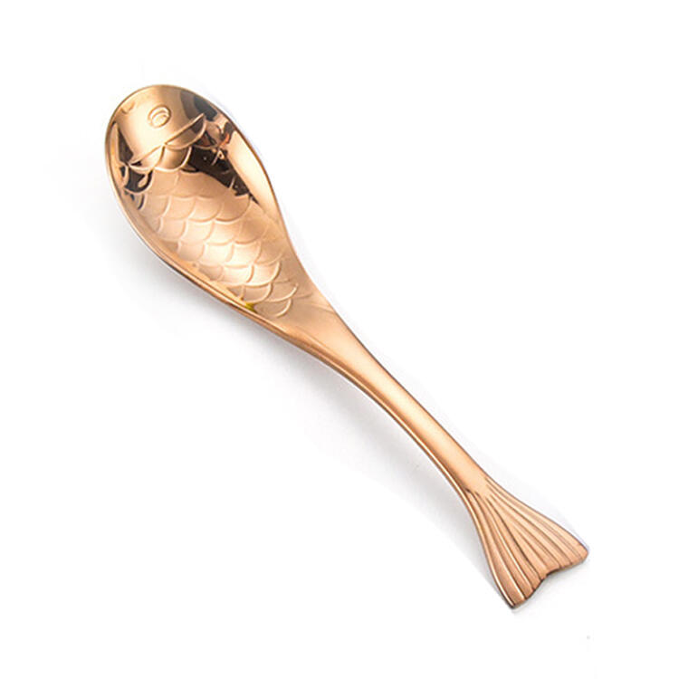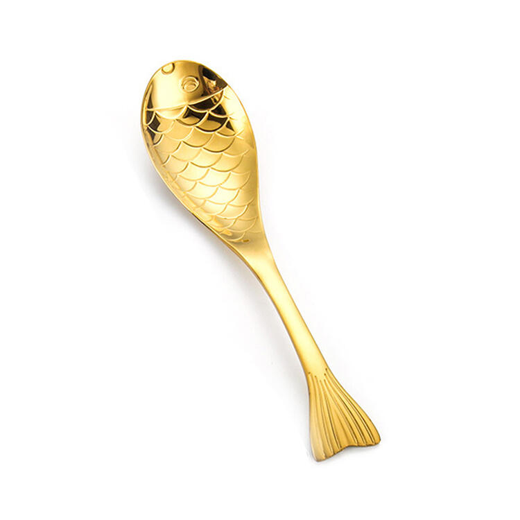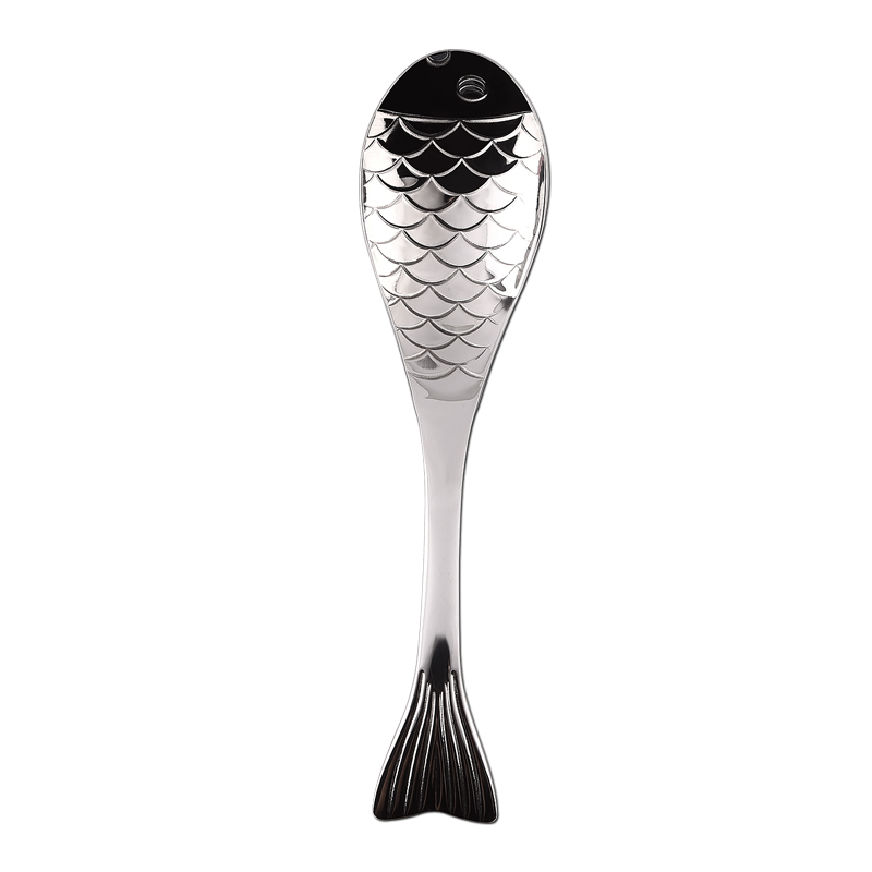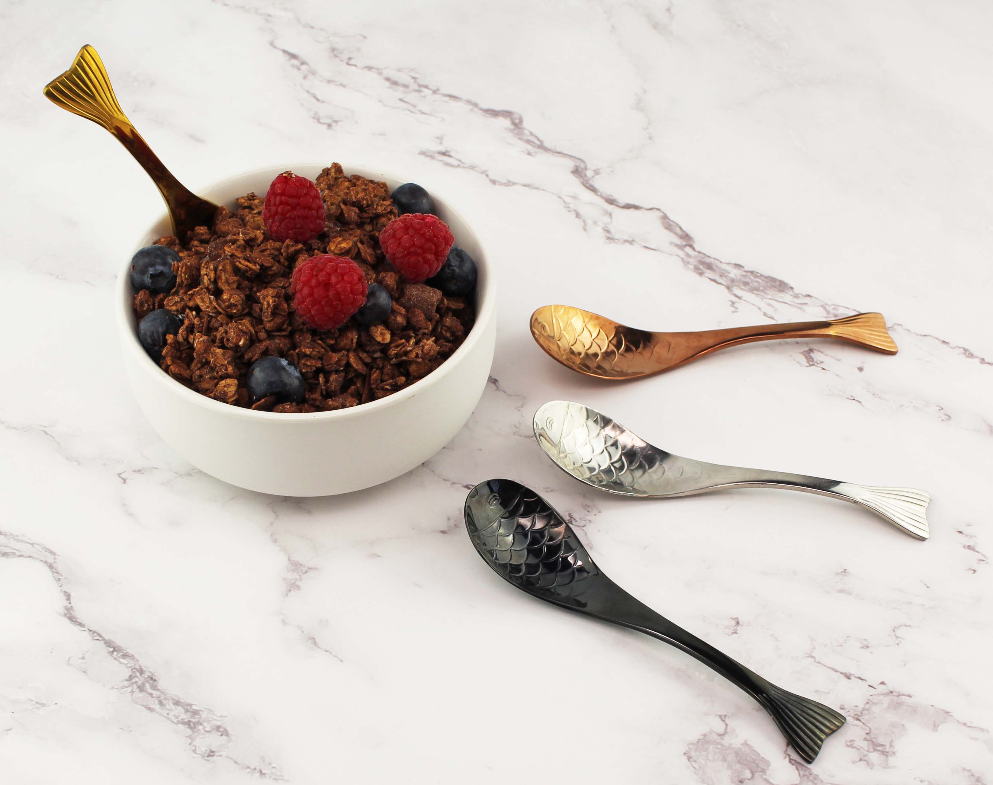 Vierteiliges Löffelset mit verschiedenfarbigen Metalllöffeln in Fisch-Optik.