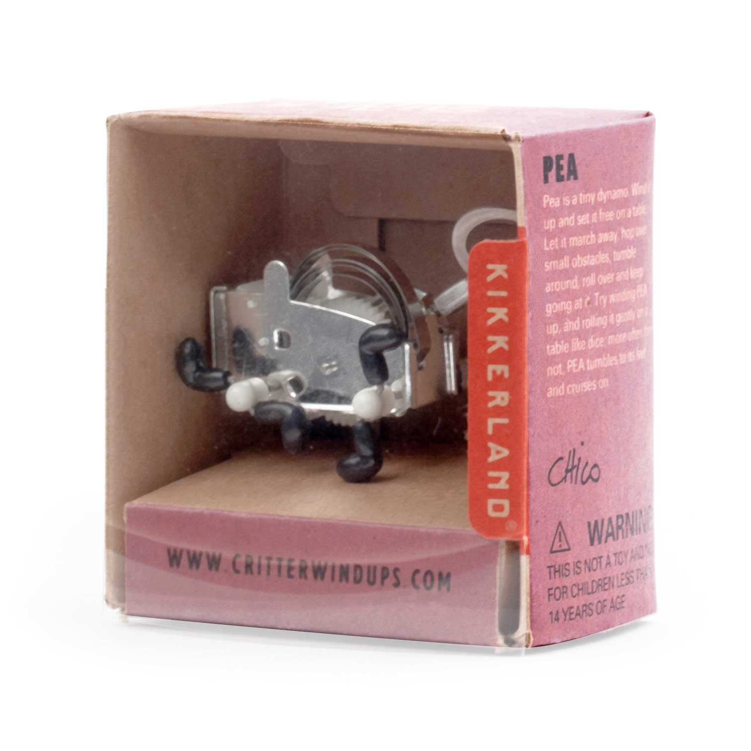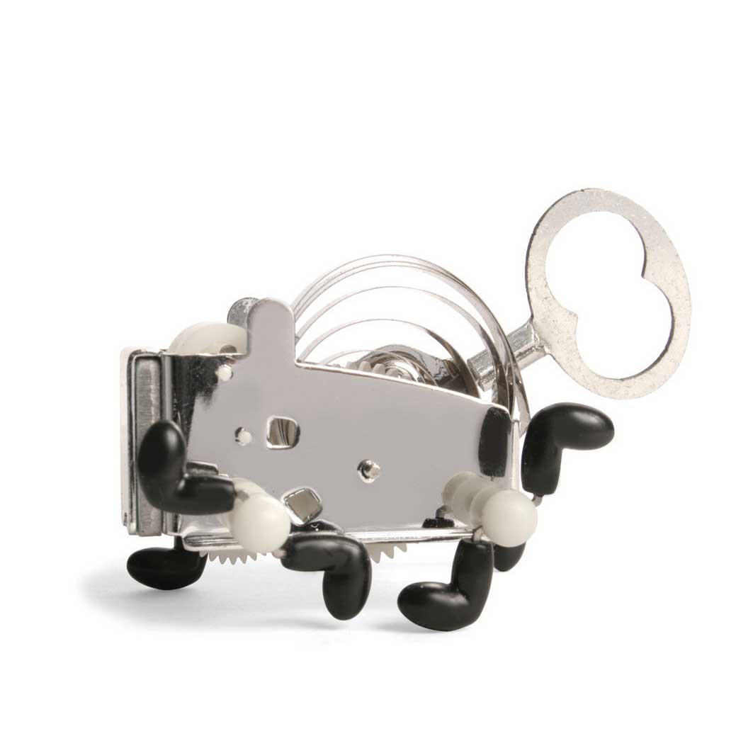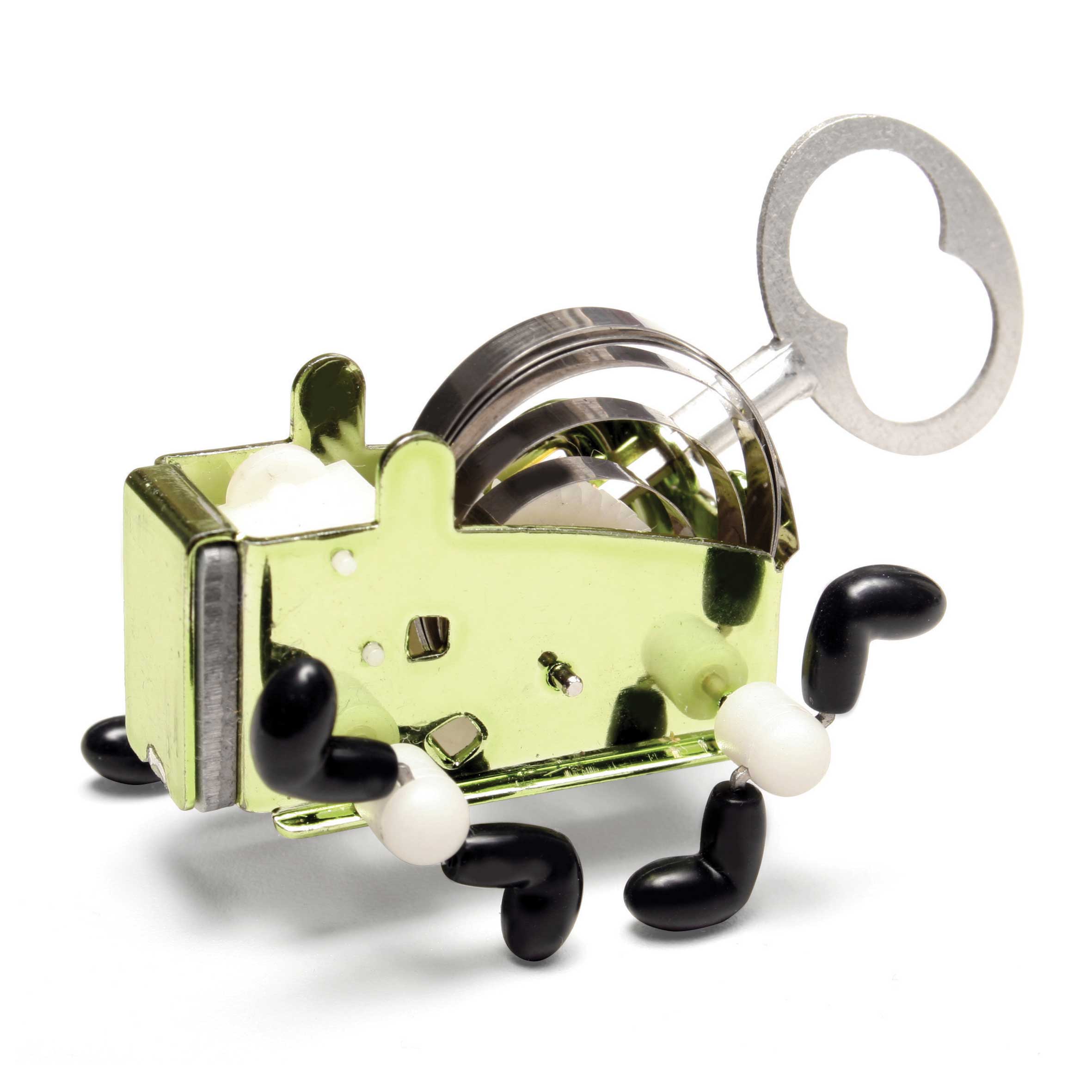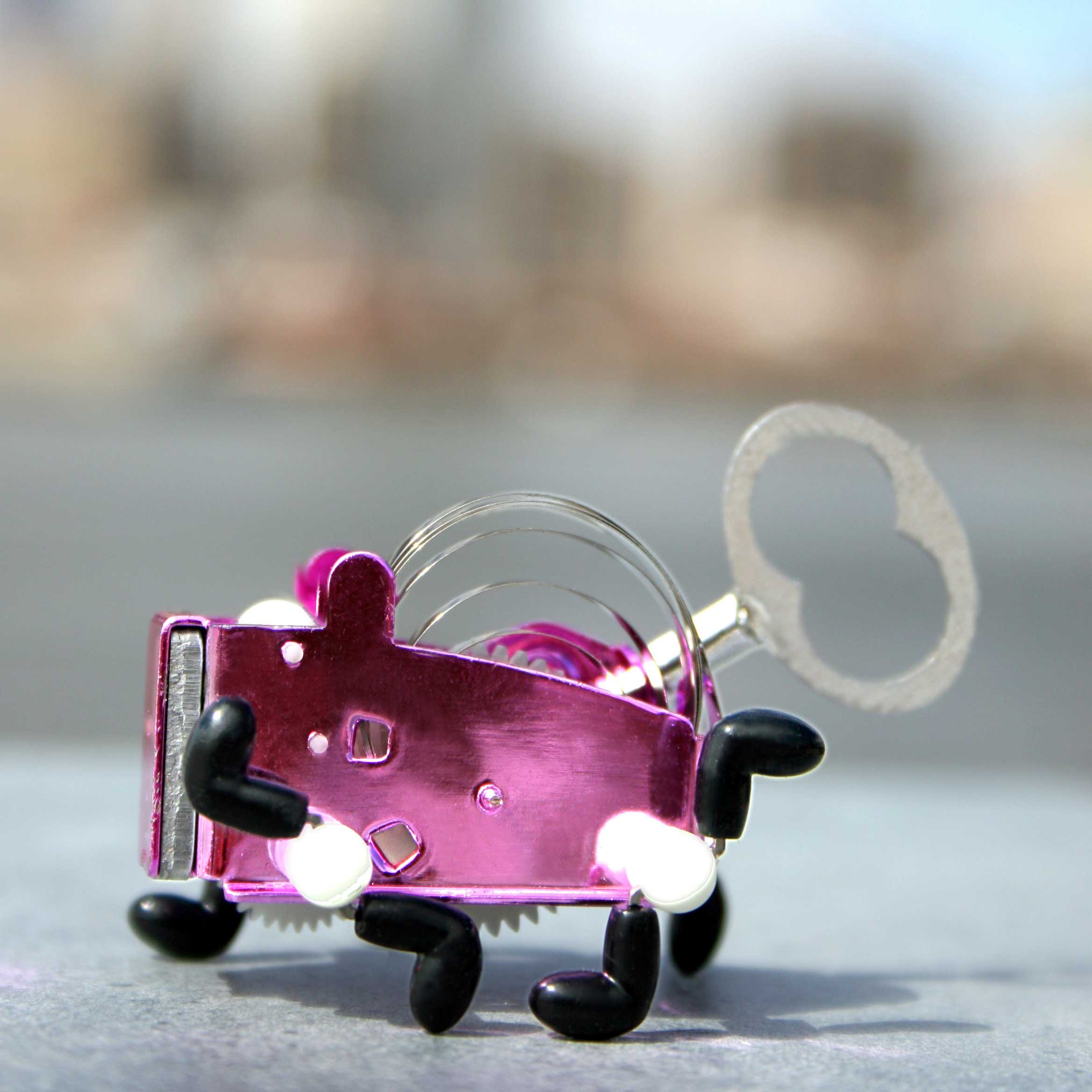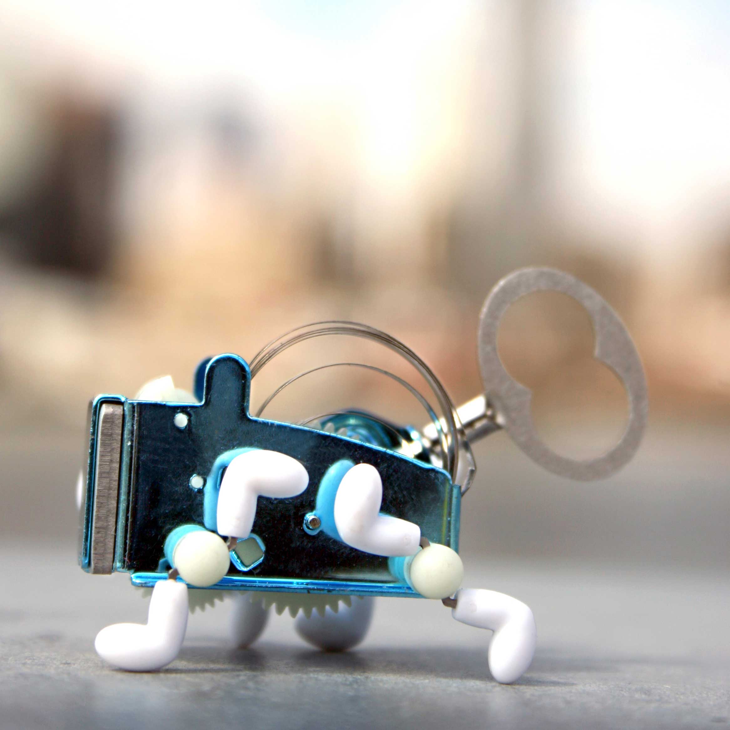 Pea ist kleiner Lauf-Roboter der von einem mechanischen Federwerk angetrieben wird. Dieses setzt das Objekt in Bewegung und lässt es kleine Hindernisse überwinden. Etwa 7 cm hoch
