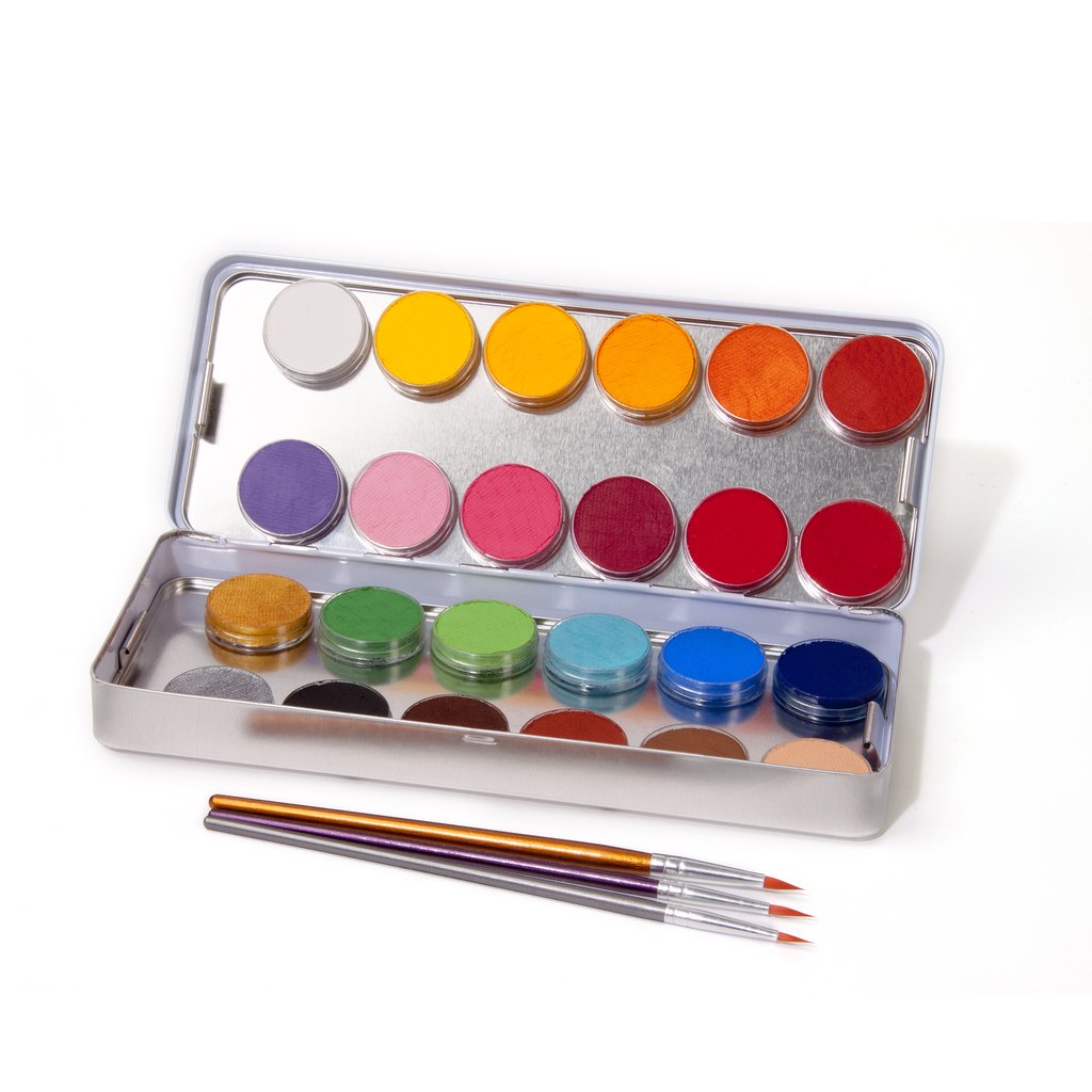 Wasser-Schminke für Face-Painting auf Wasserbasis. Für Kinderschminken oder professionelles Bühnen Make-Up.Eine praktische Zusammenstellung einer großen Auswahl an Farben im klassischen Malkastenformat. Inhalt drei Pinsel und 24 x 5 g = 120 g bzw. 24 x 3,5 ml = 84 ml.