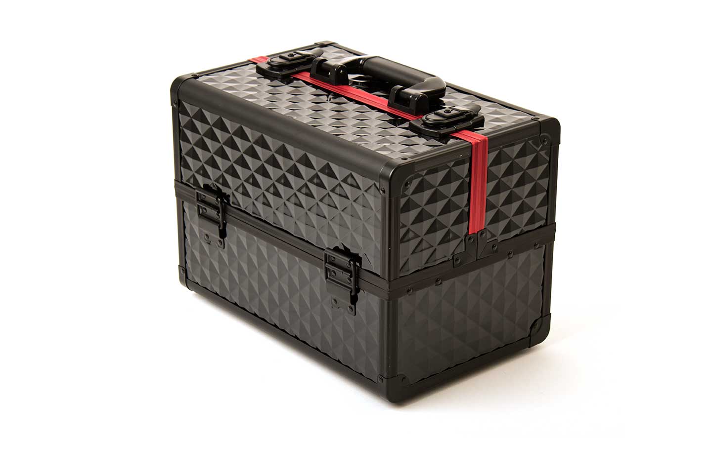 Schminkscherenkoffer aus Kunststoff mit Alu-Kanten und blechverstärkten Ecken. Farbe schwarz. Höhe 25 cm, Breite 22 cm, Länge 34,5 cm. Der Koffer wird ohne Inhalt geliefert.