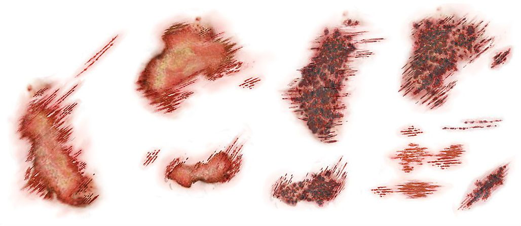 Set mit insgesamt 12 verschieden großen Schürfwunden als Klebetattoo. Noch etwas Make-up und Blutschorf dazu und Sie sehen in kürzester Zeit nach einem schwer verletzten Patienten aus. Nach dem gleichen Verfahren werden auch Hollywood-Filme ausgestattet. Sie haben also minimalen Aufwand für maximale Wirkung. Inklusive Anleitung. Hält bei schonender Behandlung mehrere Tage, kann aber auch mit Alkohol oder Babyöl entfernt werden. Material Polyester.